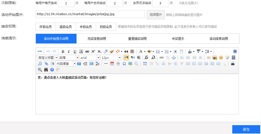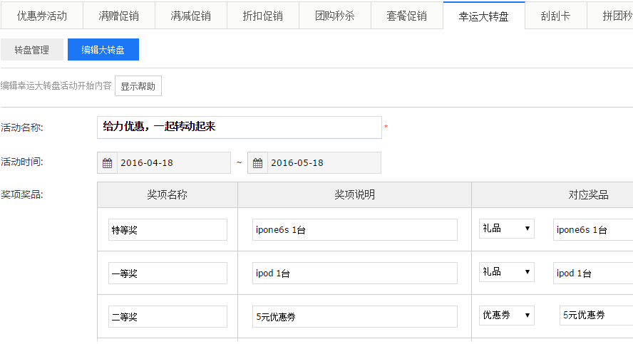 大轉(zhuǎn)盤為商家提供轉(zhuǎn)盤抽獎服務(wù),商家只需設(shè)置活動時間、活動規(guī)則、活動獎品等信息就能發(fā)起活動,粉絲進入活動界面,點擊開始抽獎,即有幾率獲得不同類型的獎品。