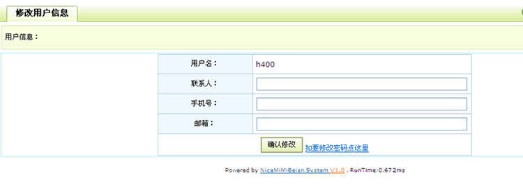 修改用戶信息:進(jìn)入該界面可以修改用戶聯(lián)系人,手機(jī)號碼和郵箱等信息及修改用戶名的密碼