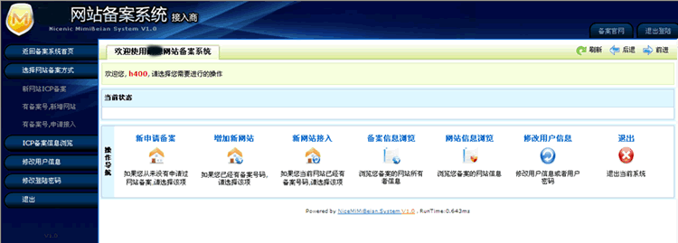 輸入備案用戶名和密碼即可進(jìn)入到備案系統(tǒng).三種方式進(jìn)入的備案系統(tǒng)界面都一樣.如下圖: