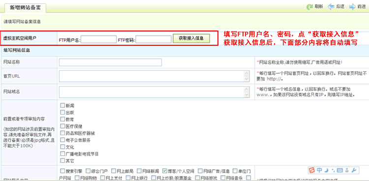 若您填寫了ftp用戶名和密碼,點擊獲取接入信息之后,您就不用填寫首頁URL、網(wǎng)站域名、服務(wù)器放置地點、接入方式和ip地址,您只需要填寫網(wǎng)站名稱即可。