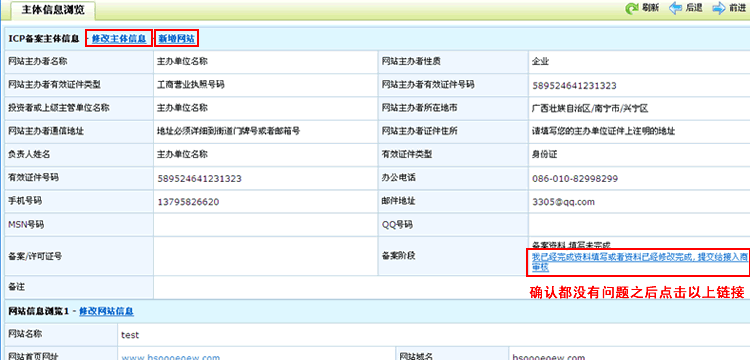若需要修改網(wǎng)站負(fù)責(zé)人基本信息則修改,如不用修改,則提交申請,提交之后鏈接到