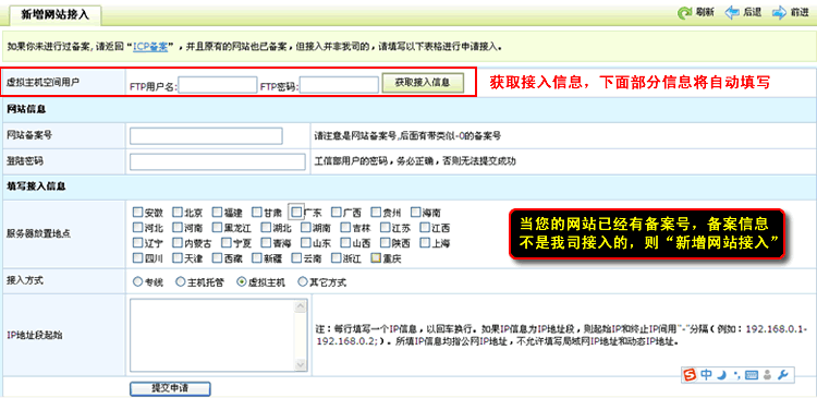 新網(wǎng)站接入:當(dāng)您的網(wǎng)站已經(jīng)有備案號,需要用我司空間,備案信息不是我司接入的,則需要進(jìn)入到“新網(wǎng)站接入