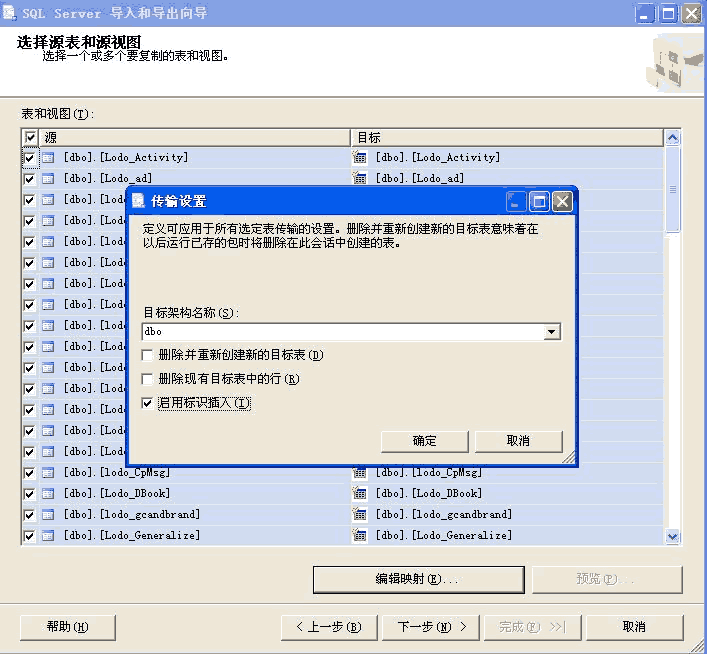 下一步到“選擇源表和源視圖”選擇需要的表后點(diǎn)擊“編輯映射”選中“啟用標(biāo)識插入”(自動增長列插入相關(guān))