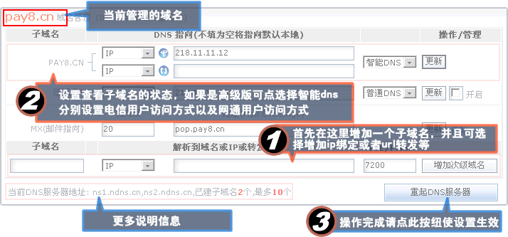 | 以下操作均以pay8.cn做為示例域名,請(qǐng)操作時(shí)結(jié)合自己的域名 域名申請(qǐng)成功后,默認(rèn)有www.pay8.cn,pay8.cn兩個(gè)域名設(shè)置記錄,以及一個(gè)泛域名設(shè)置記錄。 1、如果要設(shè)置pay.cn/www.pay8.cn的解析,請(qǐng)?jiān)趯?duì)應(yīng)的文本框中輸入解析的ip地址,或者選擇cname以及轉(zhuǎn)發(fā)等分別設(shè)置 2、泛域名設(shè)置,要設(shè)置泛域名解析,請(qǐng)勾選泛域名記錄行后的“開(kāi)啟”復(fù)選框即可設(shè)置泛域名功能 3、要設(shè)置其它的子域名,請(qǐng)?jiān)谧钕碌奈谋究蜉斎胱佑蛎⑦x擇解析或者轉(zhuǎn)發(fā)等,再設(shè)置好具體的地址后點(diǎn)“增加子域名”按扭既可增加成功,也可在增加成功后修改解析或者轉(zhuǎn)發(fā)地址。 4、高級(jí)版本的DNS管理系統(tǒng)具有智能DNS解析功能,增加子域名后,既可選擇智能DNS功能,此時(shí)同一個(gè)子域名就有“電信”和“網(wǎng)通”兩個(gè)不同的設(shè)置選項(xiàng),您可以有針對(duì)的分別設(shè)置。 |